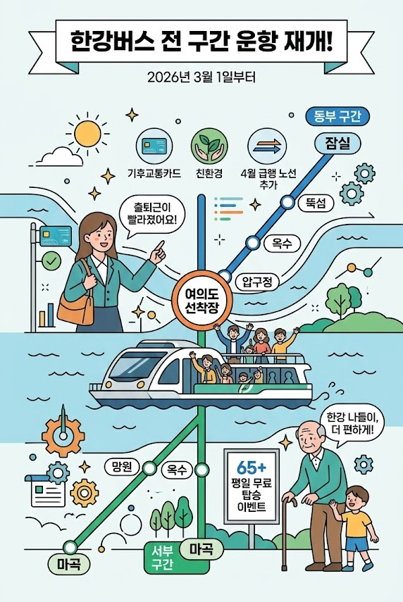 그동안 안전 점검을 위해 일부 구간만 운항했던 한강버스가 26년 3월 1일부터 전 구간 운항을 재개한다는 반가운 소식입니다.