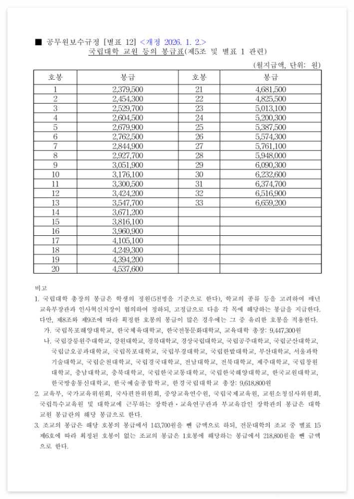 26년 인상이 적용된 국립대학 교원 봉급표 입니다.