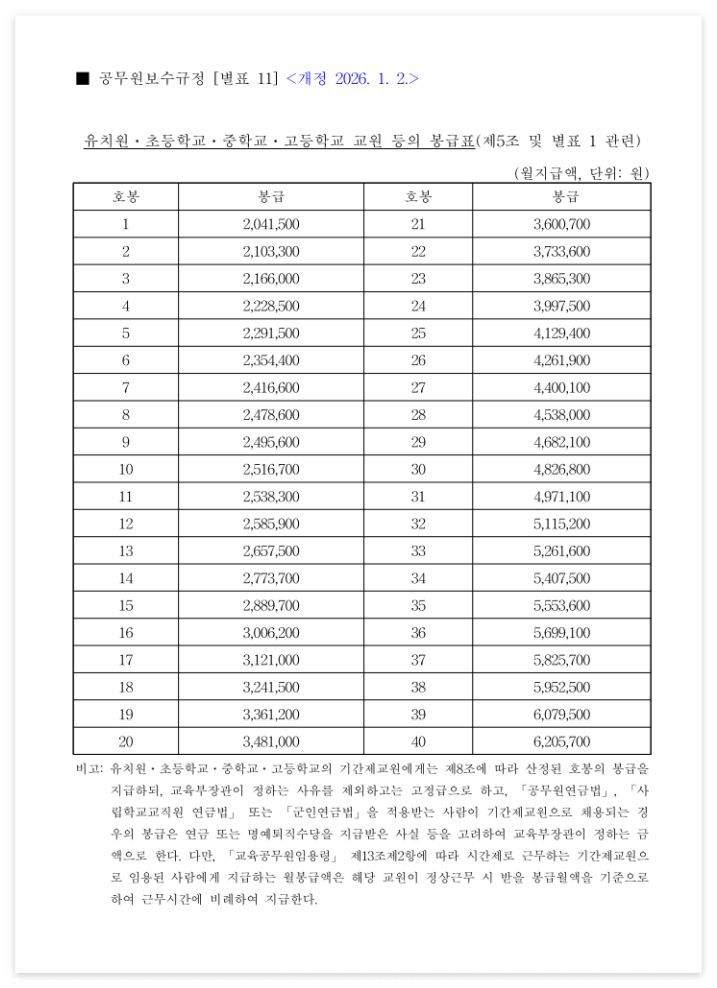 26년 인상이 적용된 유치원ㆍ초ㆍ중 ㆍ고등학교 교원 봉급표 입니다.